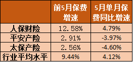观察5月单月的保费收入,财产险公司保费下降的趋势更为显著。5月,人保财险单月保费同比增速仅为4.8%,平安产险单月保费同比下降了3.97%,太保产险单月保费收入下降了4.60%。