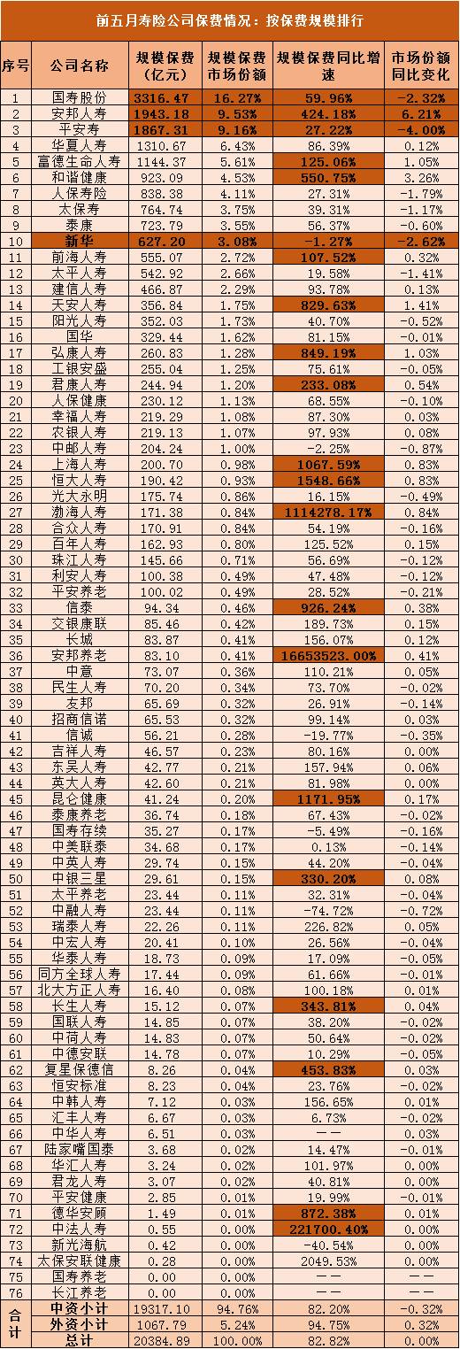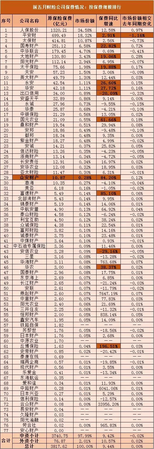 5月寿险高涨,安邦人寿稳坐榜眼之位、天安人寿增速达829.63%;产险低迷, 平安、太保增速不及3%行业动态