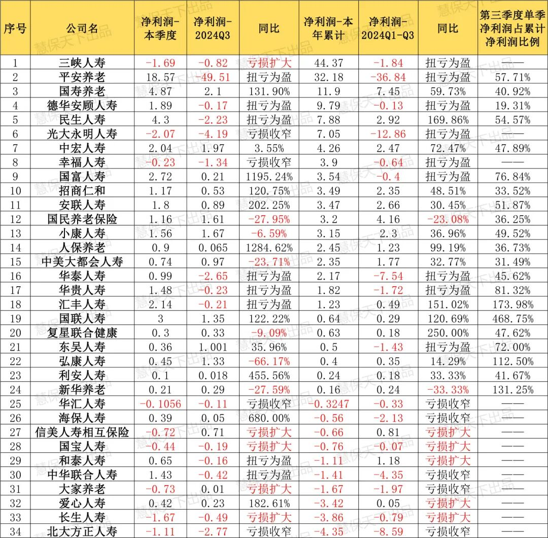 与此同时,14家险企第三季度利润降幅超20%,多家险企出现了利润减半的“腰斩”。其中下跌最为严重的恒安标准养老第三季度净利润由2024年的4500万下降到不足800万,降幅达到82.89%,前三季度累计净利润也由去年的9200万转为亏损状态。此外,还有5家险企的亏损面仍在扩大。