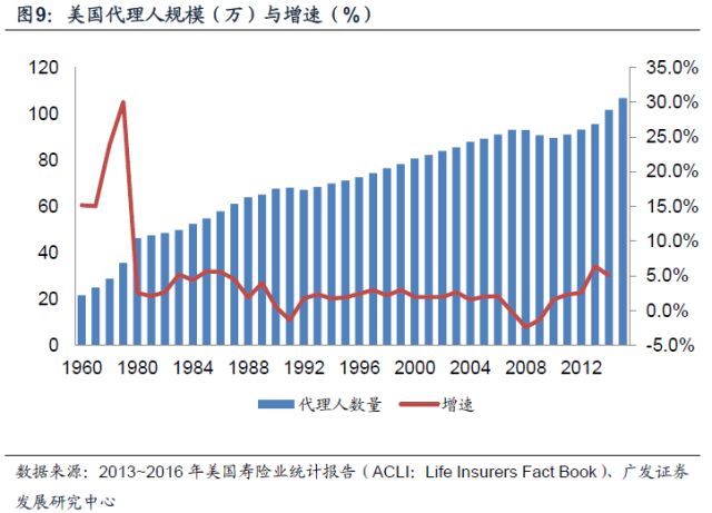 美国的保险代理人己经有150多年的历史,在寿险领域,既有仅代表一家公司的指定代理人,也有代表不同公司的非指定代理人。在2006年美国个人寿险保费收入中,专业代理人(寿险营销员)渠道保险所占比例为35%,独立代理人(经纪人)的比例为56%。截至2015年,美国总代理人规模已经达到了107万人,年增速稳定在5%以上。