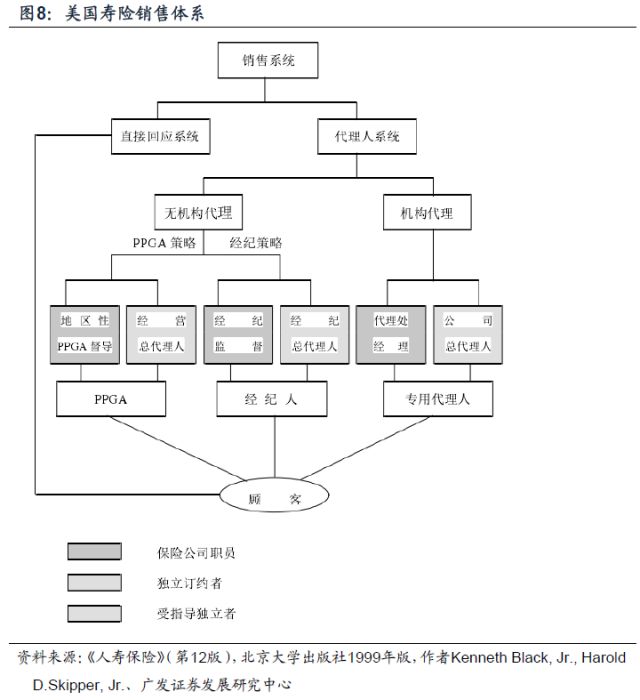 美国的寿险营销体制主要采用以专用(职业)代理人为中心的代理系统,并辅之以市场直销和经纪人推销系统,即代理人系统(Agency System)和直接回应系统(Direct Response System)。下图显示了这两类系统及其子系统。(注:PPGA 表示个人业务总代理人)