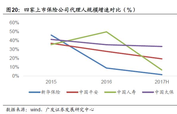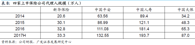 四家上市险企的代理人规模持续保持增长,截至2017年上半年,中国平安、中国人寿、中国太保和新华保险的代理人数量分别达到了132.55万人、193.7万人、87万人和33.3.万人。
