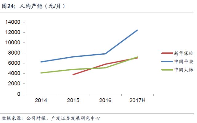 截止2017年9月,新华个险渠道规模人力33万人,同比增长13%,月均人均综合产能7093元,同比提升13%;在行业举绩率水平30%的情况下,新华个人业务举绩率达到50%,在同业中处于前列,活动人均产达到1.4万,留存率35%。