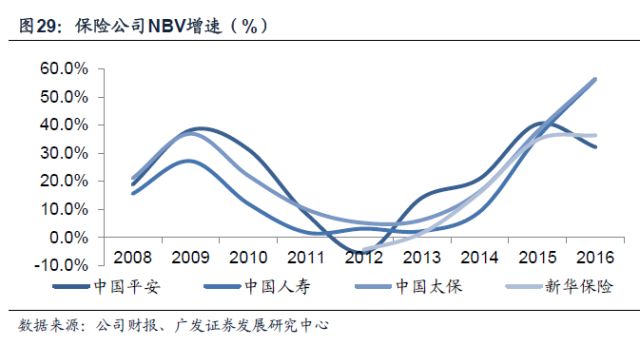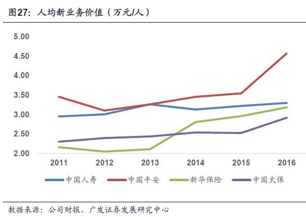 随着保险回归保障、产品结构不断优化,期交业务和个险渠道业务的占比逐步提高,将会带动人均新业务价值(新业务价值与代理人规模的比值),从而有助于保险企业的新业务价值的提升。中国平安、中国人寿、新华保险、中国太保2014—2016年人均新业务价值复合增速分别为15.04%、2.66%、6.53%、7.22%。“量”“质”齐升成为险企当前的发展方向。