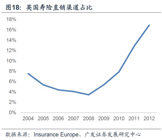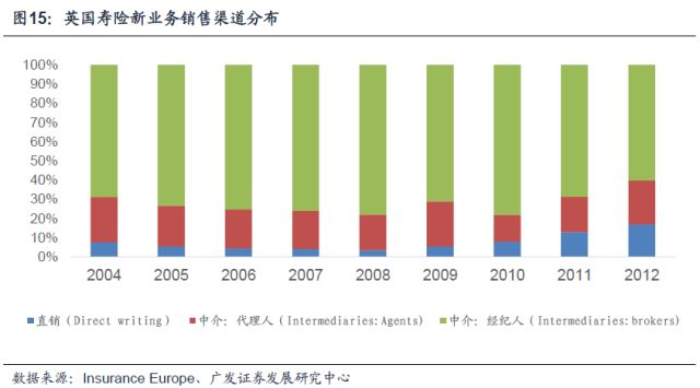 英国寿险市场的销售十分依赖中介渠道,从2004年一直到2012年,英国寿险新业务的销售中,经由中介渠道销售获得的保费收入占所有新单保费的比例均超过80%。