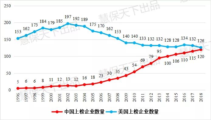 从近20多年《财富》世界500强上榜企业数量来看,美国上榜企业数量呈现先增加后减少的趋势,但总体保持稳定,从1996年的153家减少到2018年的126家,仅仅减少了27家;相对而言,中国上榜企业数量总体呈现快速增长态势,从1996年的5家,增加到2018年的120家,增加数量高达115家。