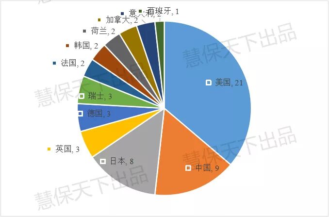 58家上榜保险企业主要分布在12个国家,其中美国上榜保险企业数量高达21家,占36.21%,遥遥领先于其他国家;中国上榜保险企业仅有9家,仅占15.52%,不到美国的一半,如果仅考虑中国内地企业,中国上榜保险企业数量将会更少。这不仅与中国企业在整个榜单的份额相差悬殊,而且与中国在世界经济中的地位不匹配。尽管日本经济规模不到中国的一半,但日本上榜保险企业数量为8家,仅比中国少一家。英国、德国、瑞士上榜保险公司数量均为3家。