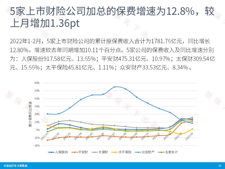 从财险公司来看,人保财险、平安产险、太保财险、太平财险、众安在线5家上市财险公司累计实现原保费收入1781.76亿元,同比增12.8%。