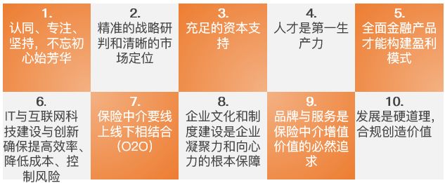 此外还包括IT、互联网科技建设与创新,确保提高效率、降低成本、控制风险;线上线下相结合;以企业文化和制度建设作为企业凝聚力和向心力的根本保障;品牌与服务是保险中介增值价值的必然追求;发展是硬道理,合规创造价值。