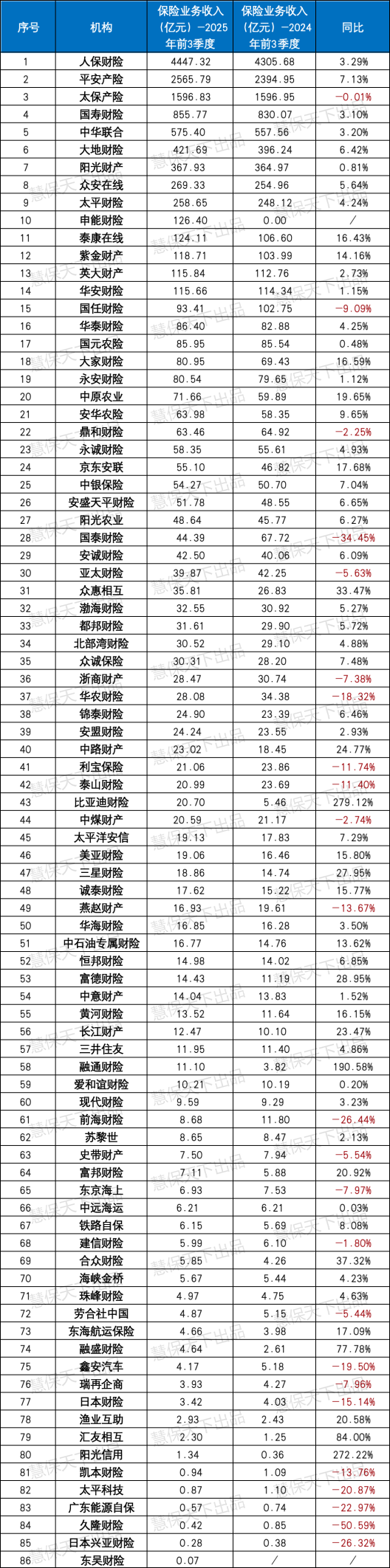2025年前三季度,85家财险公司合计实现保险业务收入1.37万亿元,同比增长4.94%,增速较2024年同期略有回升,行业负债端呈现稳中有进的态势。