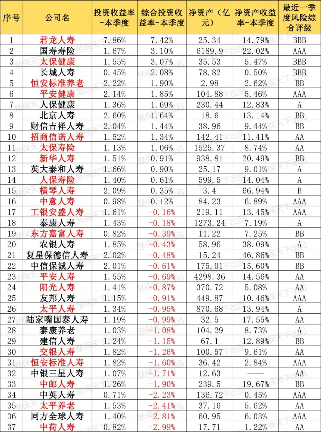 综合投资收益率方面,有5家险企第三季度单季的综合投资收益率超过3%。在这5家险企中,国寿寿险、太保健康、平安养老均为“老五家”出身,而君龙人寿、小康人寿分别以7.42%、5.23%的数据位列第三季度“投资高手”前二甲。
