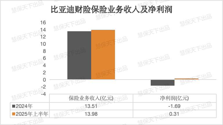 在此背景下,主打新能源车险的比亚迪财险交出了一份“亮眼”的半年成绩单:2025年上半年,这家恢复业务仅一年多的"车企系"险企实现保险业务收入13.98亿元,得益于去年同期基数较低,同比增速达到1978%,不仅超越去年一整年业绩,更实现净利润3134.59万元,相较其2024年亏损1.69亿元成功扭亏为盈,也打破了财险行业平均需要3-4年培育期的传统认知。