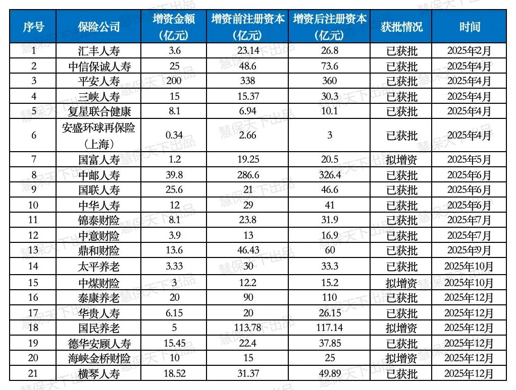 相比之下,增资看似更现实,实则同样艰难。2025年,全行业共有20家险企完成或拟进行增资,总规模419.2亿元,但资源分配的失衡问题极为突出:仅4家中大型险企便占据了63.2%的增资额度,其中平安人寿单次增资200亿元,中邮人寿增资39.8亿元;而16家中小险企合计仅获得154.4亿元增资,占比36.8%,单家平均增资额不足10亿元,远低于行业21亿元的平均水平。