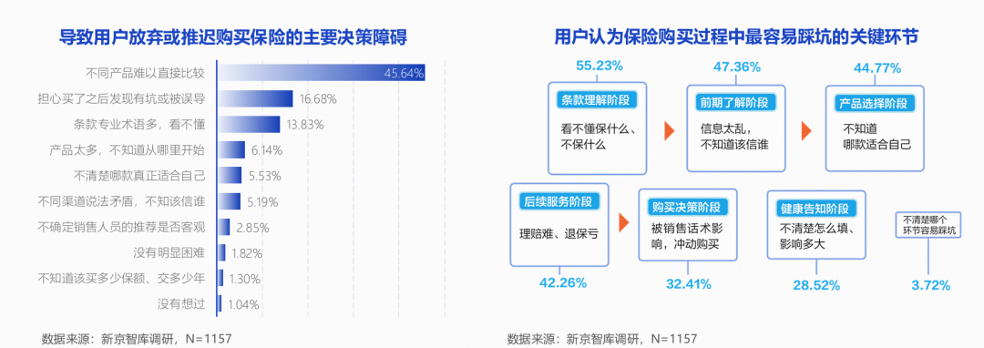 第三座大山,则是在海量的产品之下,难以匹配最合适自己的,产品比较易陷入信息迷宫。《报告》显示,45.64%的用户将“不同产品难以直接比较”列为放弃或推迟购买的首要原因。海量产品、复杂责任、非标表述,使用户难以建立有效的横向比较框架。