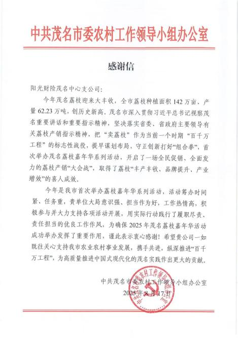 在做实保险主业的同时,阳光财险积极融入地方发展大局,参与搭建“政府—企业—农户”三方联动的高效协作平台,护航茂名荔枝产业发展。