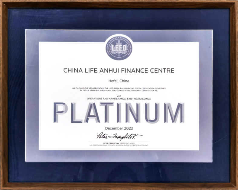 图:中国人寿安徽金融中心获得LEED铂金级认证