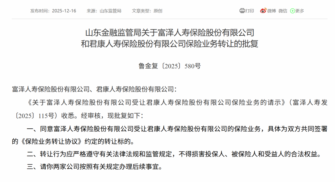 继11月获发保险许可证后,12月16日,国家金融监督管理总局山东监管局发布多份批复,同意富泽人寿正式受让君康人寿保险业务,具体为双方共同签署的《保险业务转让协议》约定的转让标的;同意富泽人寿开业,营业场所位于山东省济南市,并接受山东金融监管局的属地监督管理。