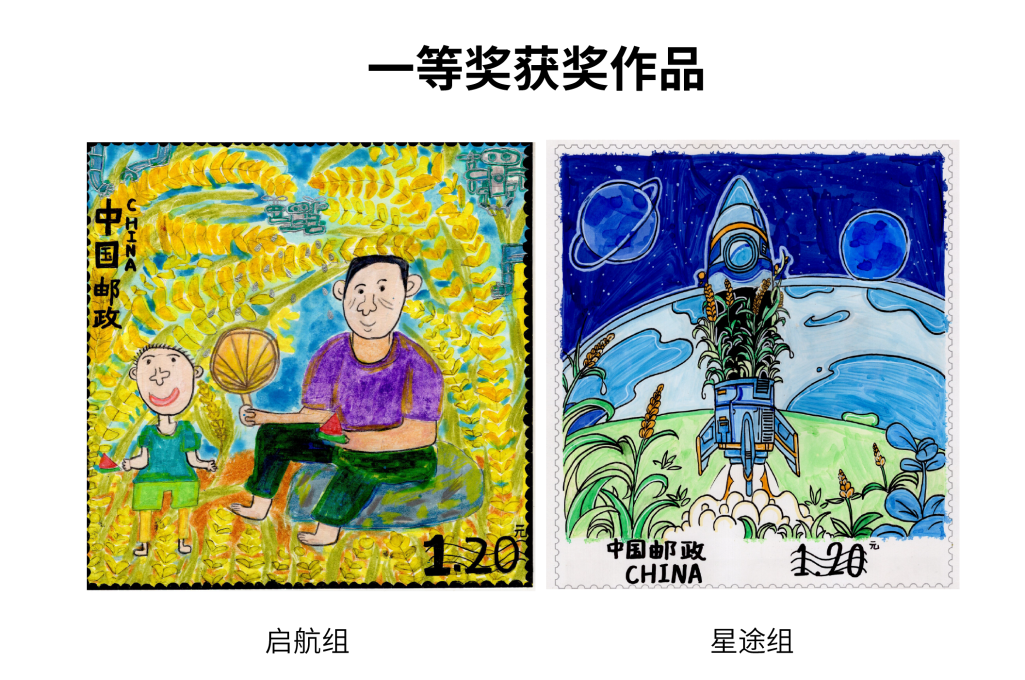 本届全国少儿邮票设计大赛历时四个月,经过作品征集、各赛区初选、全国总决赛评选三个阶段,共收到8.6万余幅来自全国各地的参赛作品,最终评选出一等奖2名、二等奖6名、三等奖10名。其中,来自浙江的洪颢、湖南的周玉妍,分别凭借作品《禾下科技梦》《水稻移植计划》摘得了启航组、星途组桂冠。
